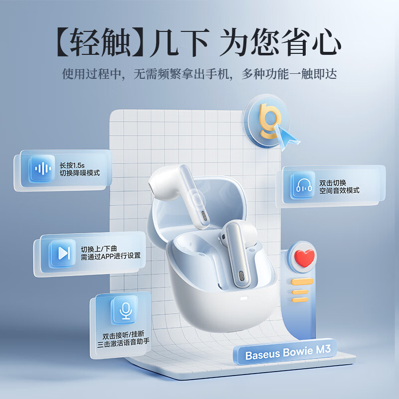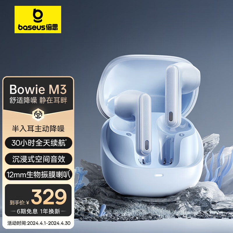 倍思(baseus)M3 真无线蓝牙耳机 主动降噪耳机 半入耳舒适降噪 30h长续航蓝牙5.3适用苹果小米华为手机 蓝价格:399.00元!