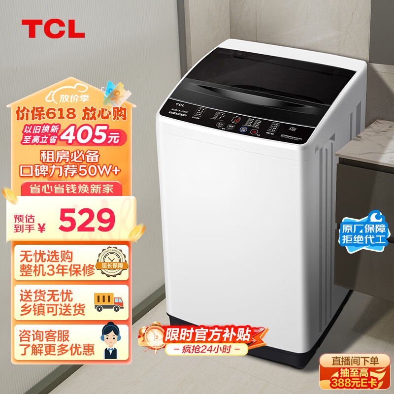 TCL 5.5KG全自动波轮洗衣机 宿舍租房神器 小型迷你洗衣机全自动家用 以旧换新 XQB55-36SP价格:529.00元!