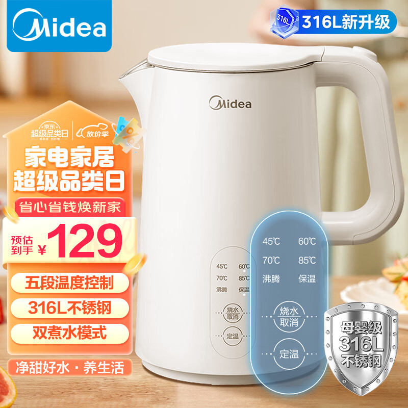 美的(Midea)电水壶热水壶烧水壶开水壶控温壶316L不锈钢内胆1.5L侧显温度智能自动断电15X301-PRO价格:129.00元!
