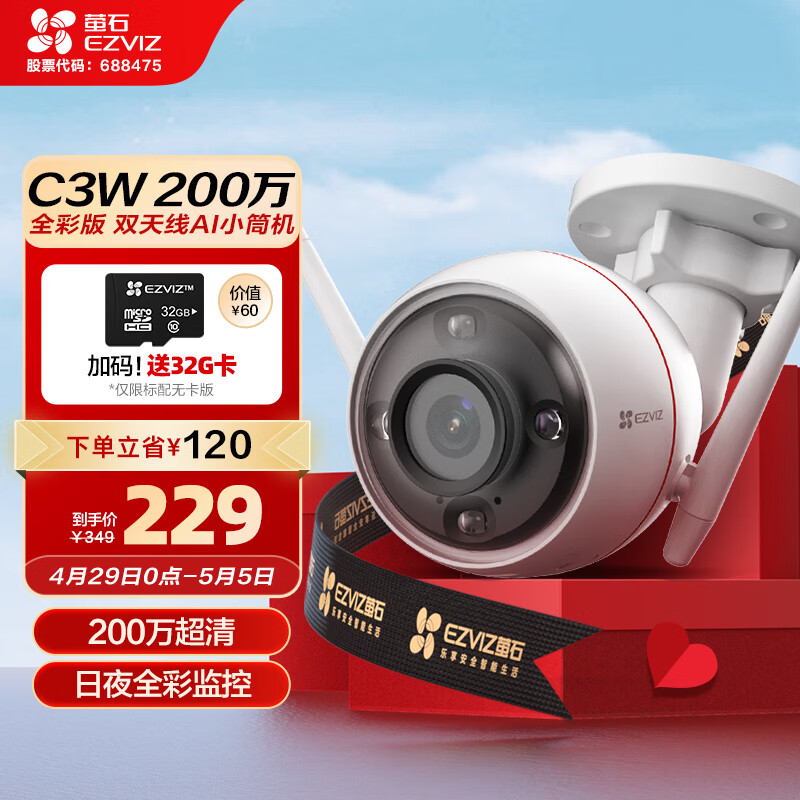 萤石(EZVIZ) C3W1080P2.8mm 全彩版摄像头 智能无线高清网络wifi远程监控摄像头枪机价格:229.00元!