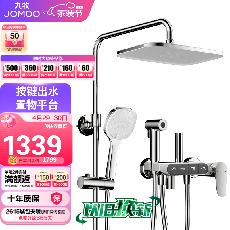 九牧(JOMOO)花洒套装 按键四分水大流量顶喷除垢置物喷枪36492-658/1B-1价格:1649.00元!