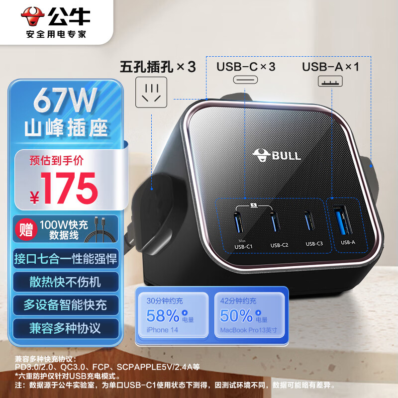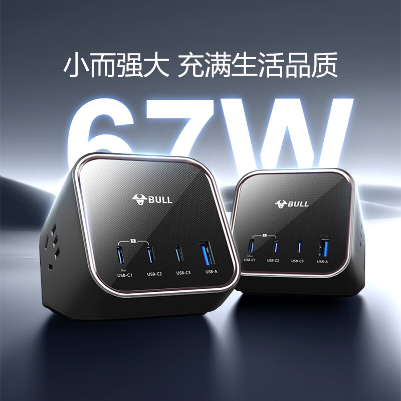 公牛(BULL)67W PD苹果快充笔记本多功能插座/插线板/插排/接线板 USB(3C1A)+3插孔 全长1.5米 GNV-MS1673价格:175.00元!