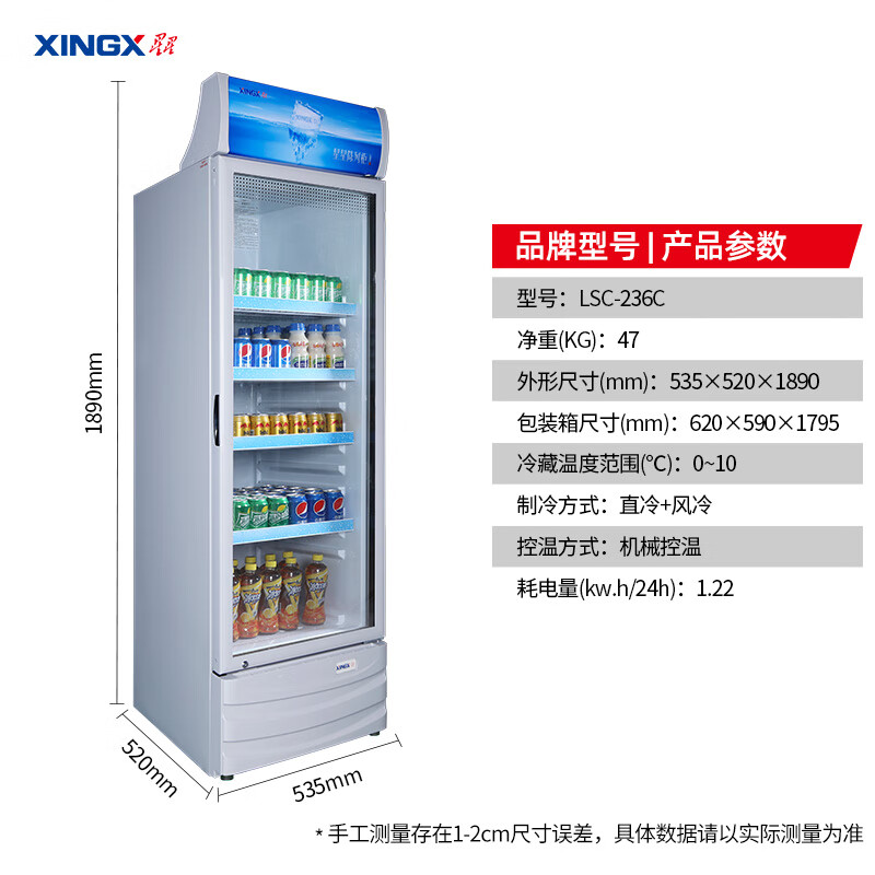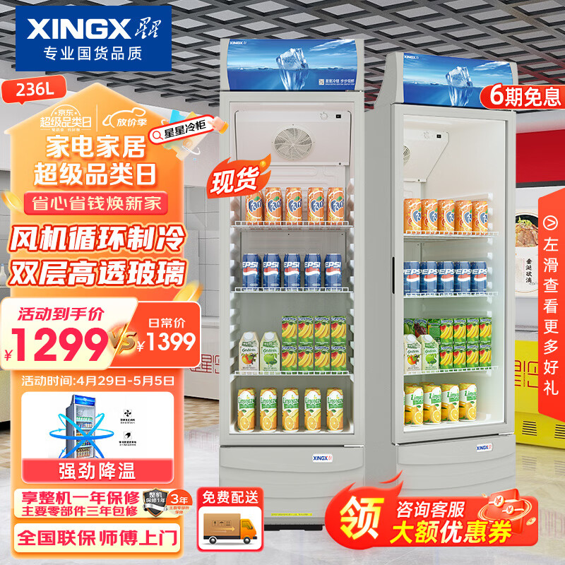 星星(XINGX) 236升 立式玻璃门冷柜 饮料陈列柜 商用冷藏冰箱(银灰色) LSC-236C价格:1299.00元!