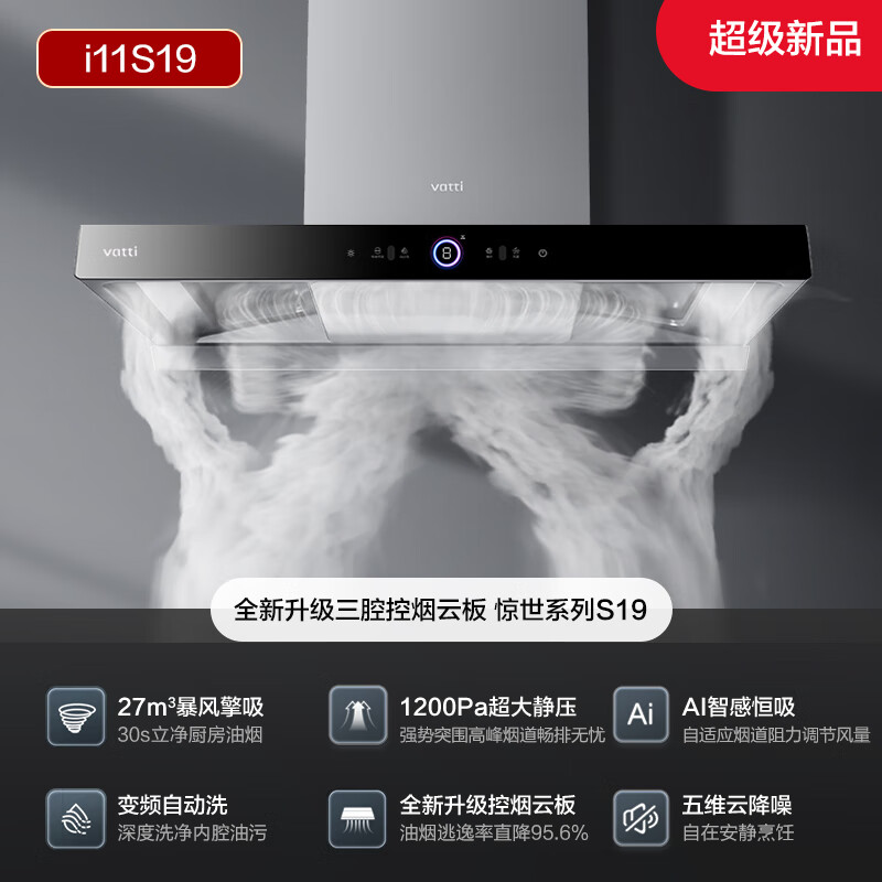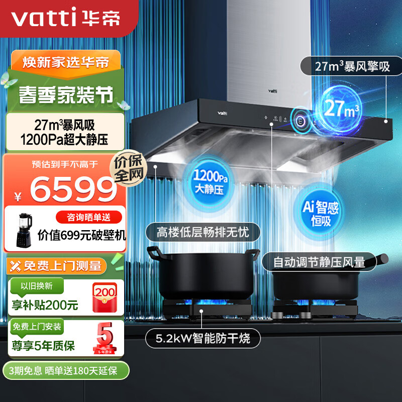 华帝(VATTI)抽油烟机欧式顶吸三腔S19家用变频大吸力27风量自动清洗烟机防干烧燃气灶具烟灶套装 i11186天然气价格:6599.00元!