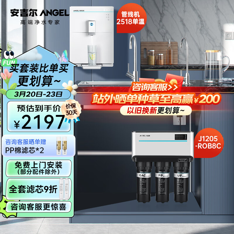 安吉尔净水器家用过滤器套装【J1205-ROB8C+管线机2518】厨下式反渗透纯水机双出水机价格:2197.00元!