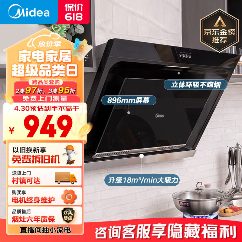 美的(Midea)抽油烟机 家用侧吸式吸油烟机 大吸力排烟机 896mm宽屏拢吸 厨房老式脱排烟机CXW-200-J30价格:944.00元!
