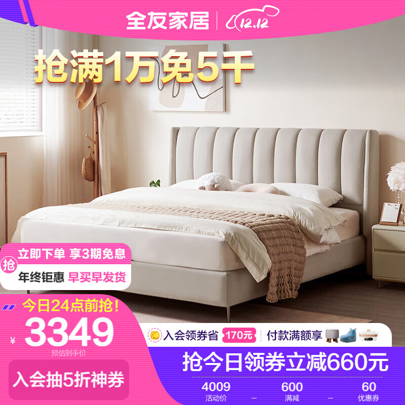 全友家居 床现代简约科技布床双人床主卧室1.8米舒适软靠家具105207CK价格:4009.00元!