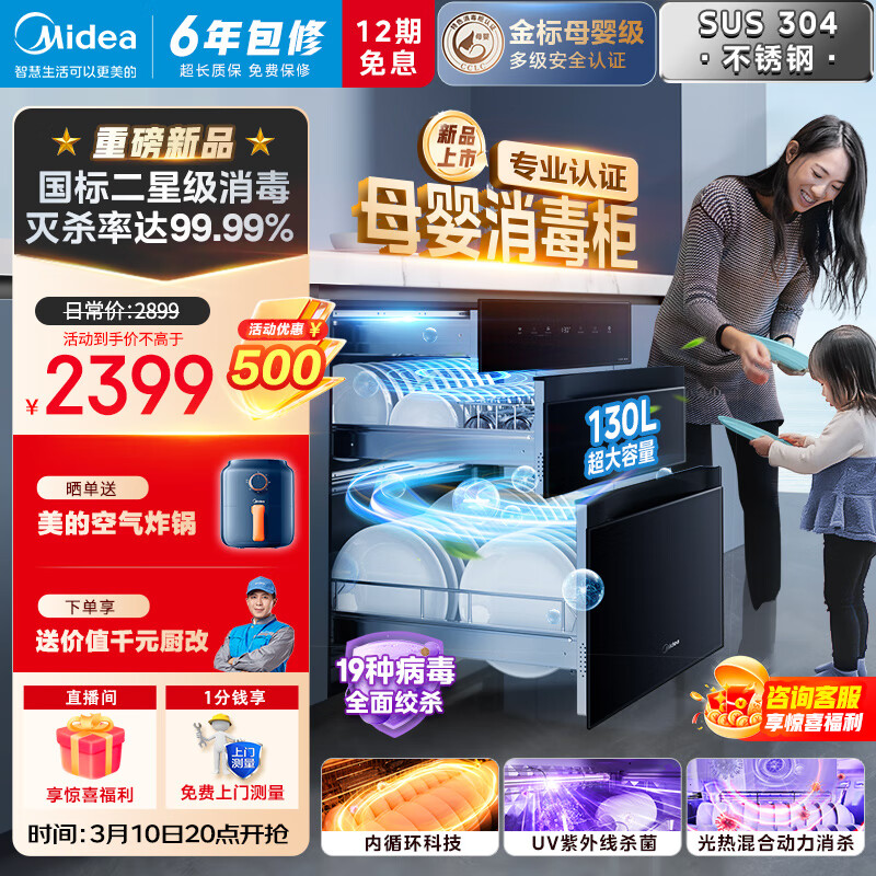 美的(Midea)消毒柜家用嵌入式厨房餐具碗柜碗筷 紫外线+光波 热风烘干 婴儿奶瓶130L三层大容量灭菌舱130B03价格:2599.00元!