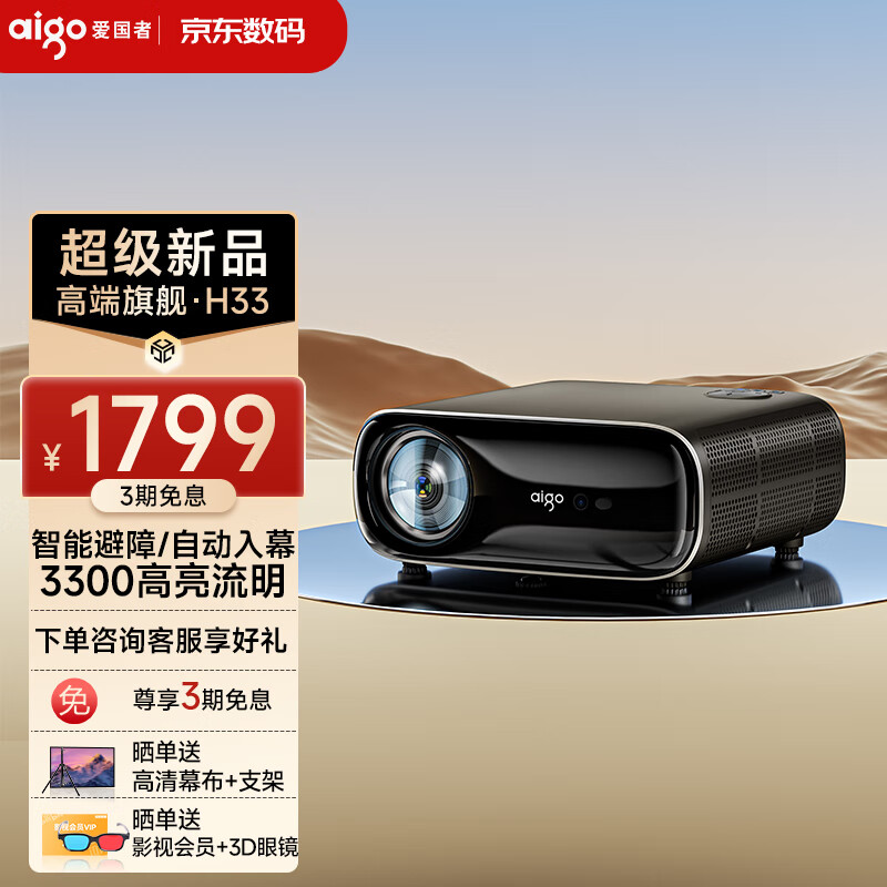 爱国者(aigo)H33Pro升级版 投影仪家用 投影机办公培训会议电视(3300流明 高清高亮 自动入幕 自动避障对焦)价格:1999.00元!
