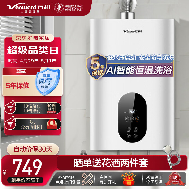 万和(Vanward)13升燃气热水器天然气家用热水器66重防护AI智能体感恒温防电防冻JSQ25-370J13价格:749.00元!