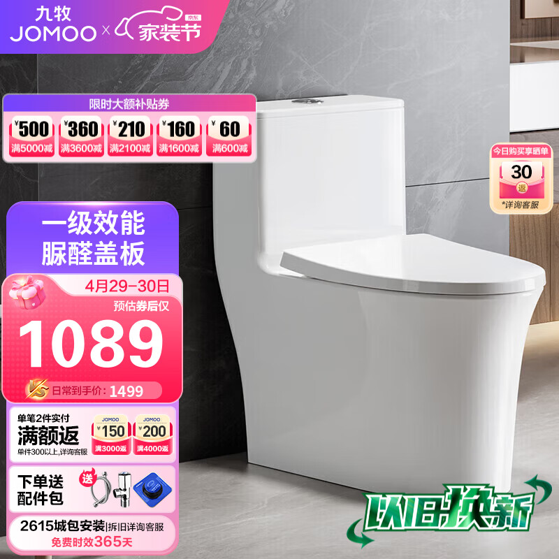九牧(JOMOO)11368-2-2/41K-2马桶家用大冲力暴风虹吸节水抗菌坐便器400坑距价格:1649.00元!