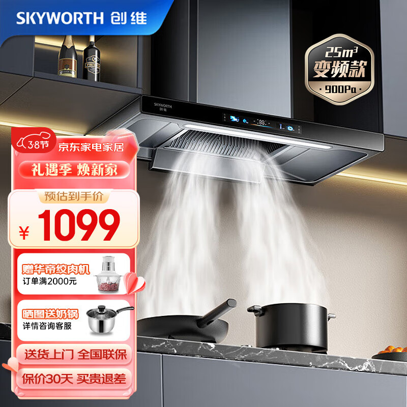 创维(Skyworth)油烟机 家用抽油烟机25大吸力变频欧式顶吸油烟机 彩屏智控 自动清洗挥手智控Y010价格:1199.00元!