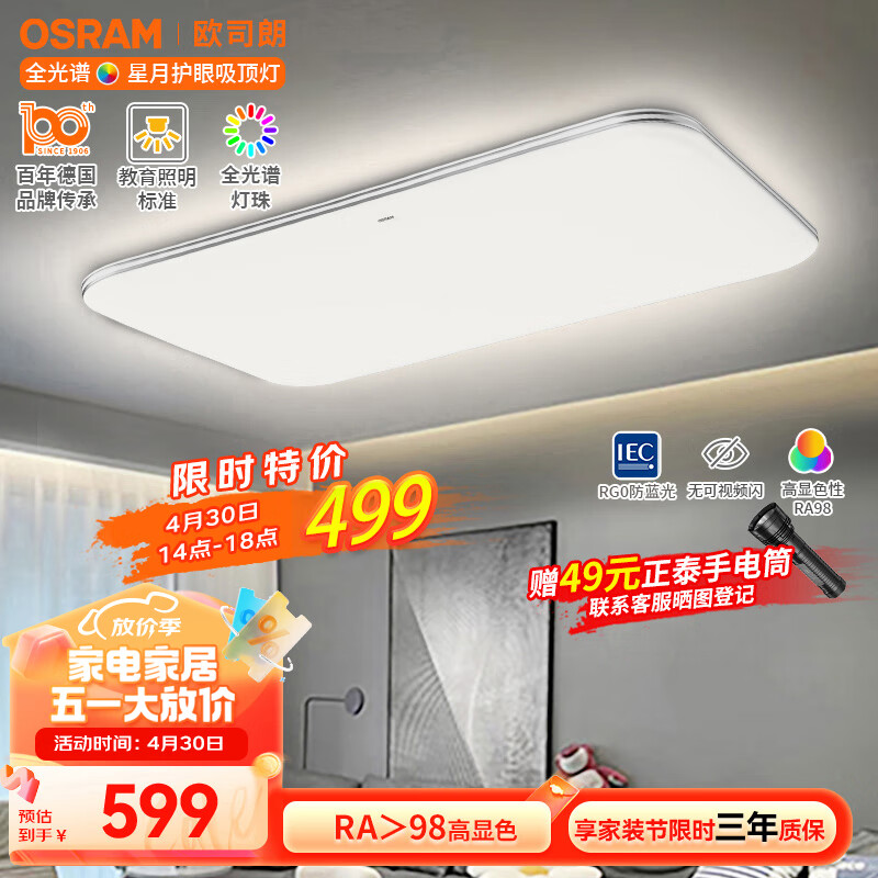 欧司朗(OSRAM)吸顶灯客厅灯遥控大灯护眼无极调光灯具全光谱-星月银135瓦价格:999.00元!