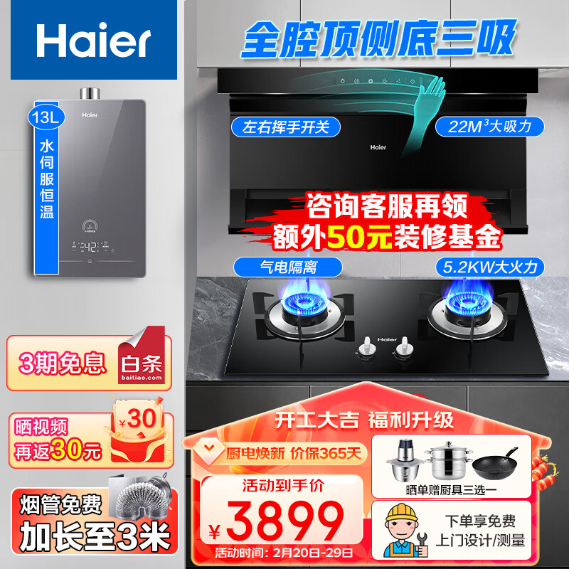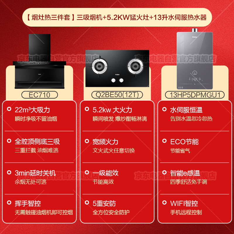 海尔(Haier)抽油烟机燃气灶套装22m3顶侧双吸免清洗EC710+5.2KW灶Q2BE50+13升热水器HP5厨房三件套[家电]价格:4099.00元!