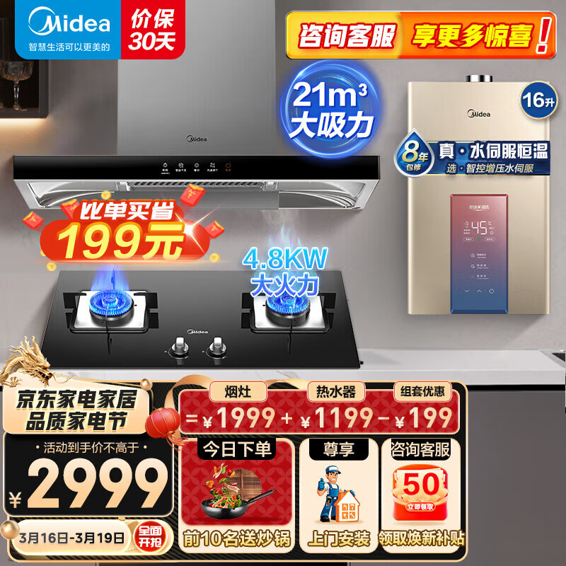 美的(Midea)欧式顶吸抽油烟机灶具烟灶多件套装燃气热水器家用烟灶燃热厨房三件套T201-L+Q217B+16MK3天然气价格:3299.00元!