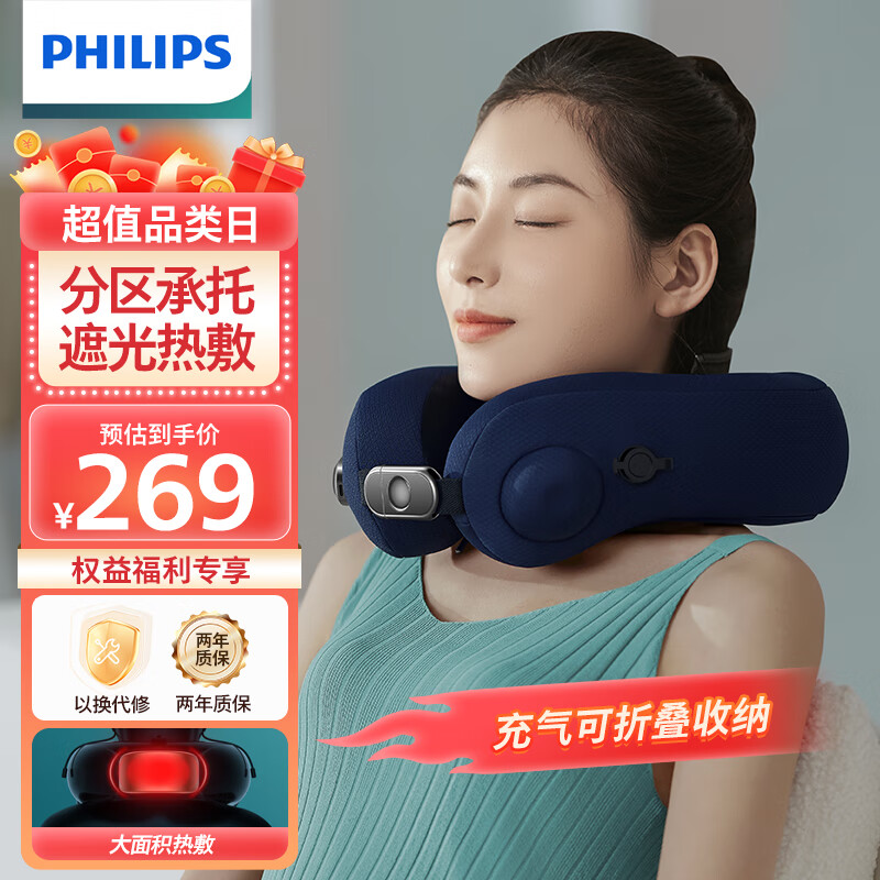 飞利浦(PHILIPS)充气式U型枕午睡枕头睡眠颈椎枕专用 热敷护颈枕 肩颈按摩器颈部按摩仪按摩枕头 3101N价格:269.00元!