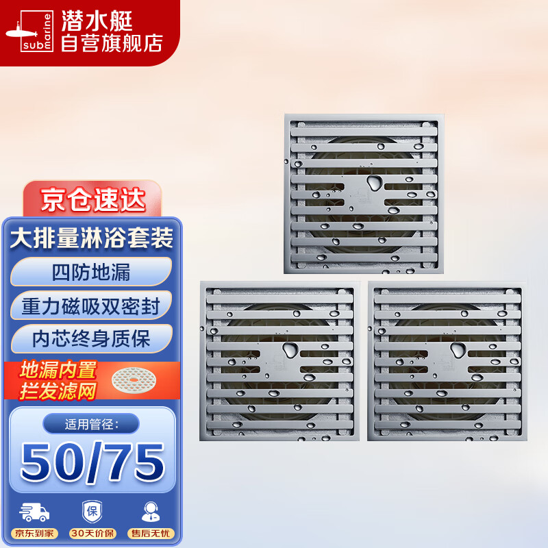 潜水艇(Submarine)铜镀铬镜面防臭地漏套装 50管径 三个装大排量淋浴地漏 超值套装价格:317.00元!