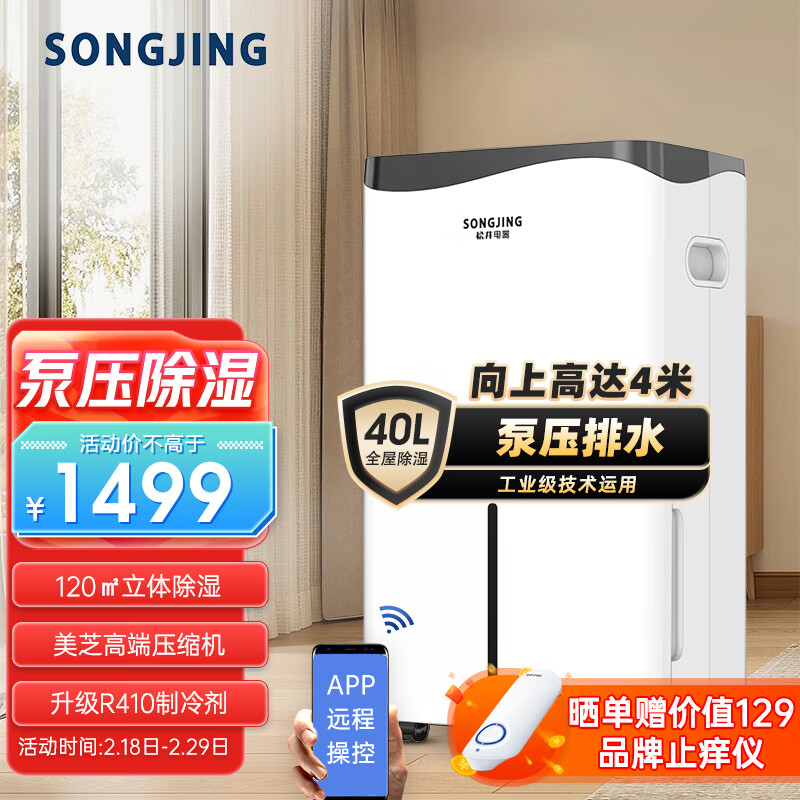 松井(SONGJING)除湿机 抽湿机家用 除湿器室内 吸湿器70-120㎡ 40升/天 泵压排水地下室工业去湿机SJ-402E价格:1554.00元!