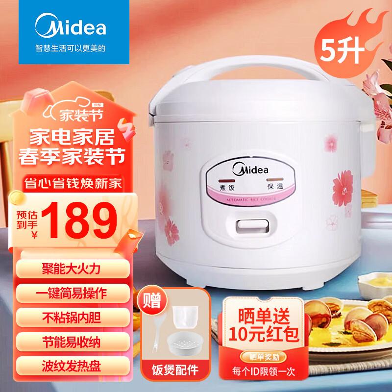 美的(Midea)电饭煲家用电饭锅多功能柴火饭机械式智能煮饭3L4L5L 美的YJ508J【2-10人用】 5L价格:189.00元!