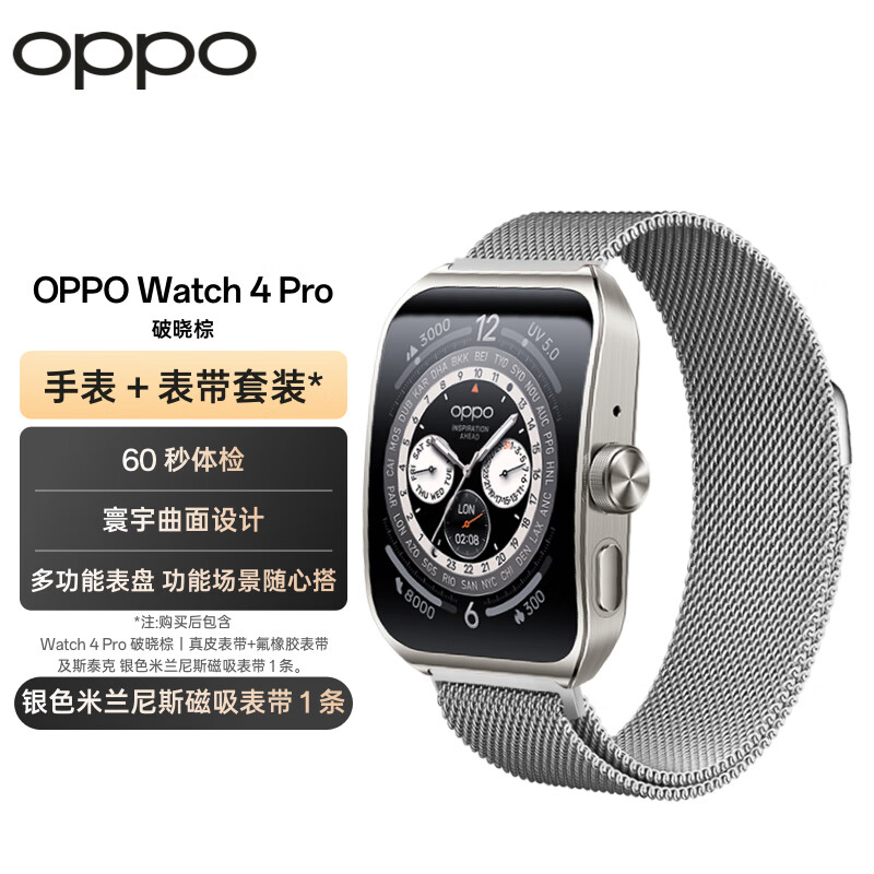 OPPO Watch 4 Pro 破晓棕 全智能手表 男女运动手表 智能健康eSIM电话手表+银色米兰尼斯表带套装价格:2528.00元!