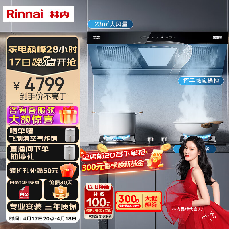 林内(Rinnai)欧式跨界抽烟机 23立方大吸力 挥手智控热清洗 定时防干烧4.2KW莲花火燃气灶 NM11T+2E03LS价格:4799.00元!