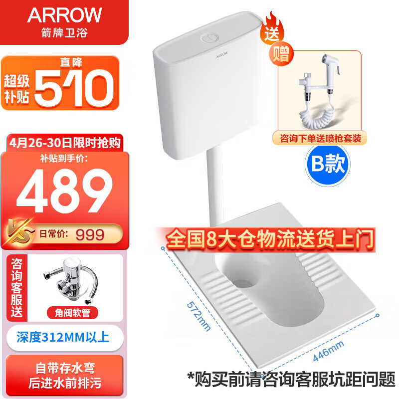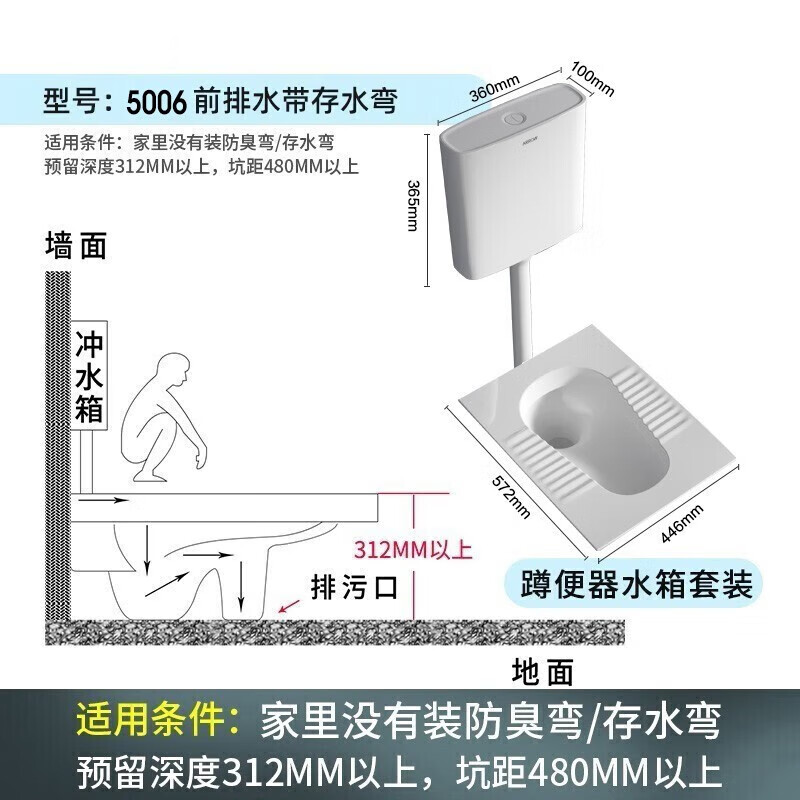 箭牌(ARROW)蹲便器水箱组合陶瓷大便器蹲厕整套蹲便池带存水弯蹲便器水箱 B款带存水弯前排污深度312验货收价格:999.00元!