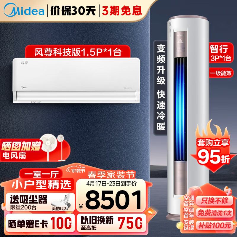 美的(Midea)空调套装 小户型精选 一室一厅(1.5匹风尊科技版一级挂机+3匹智行柜机一级)一套购齐价格:8948.00元!
