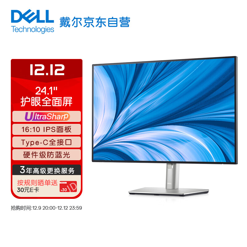 戴尔(DELL)UltraSharp 24.1英寸 办公显示器 IPS 16:10 防蓝光 Type-C90W反向充电 旋转升降支架 U2421E价格:2299.00元!