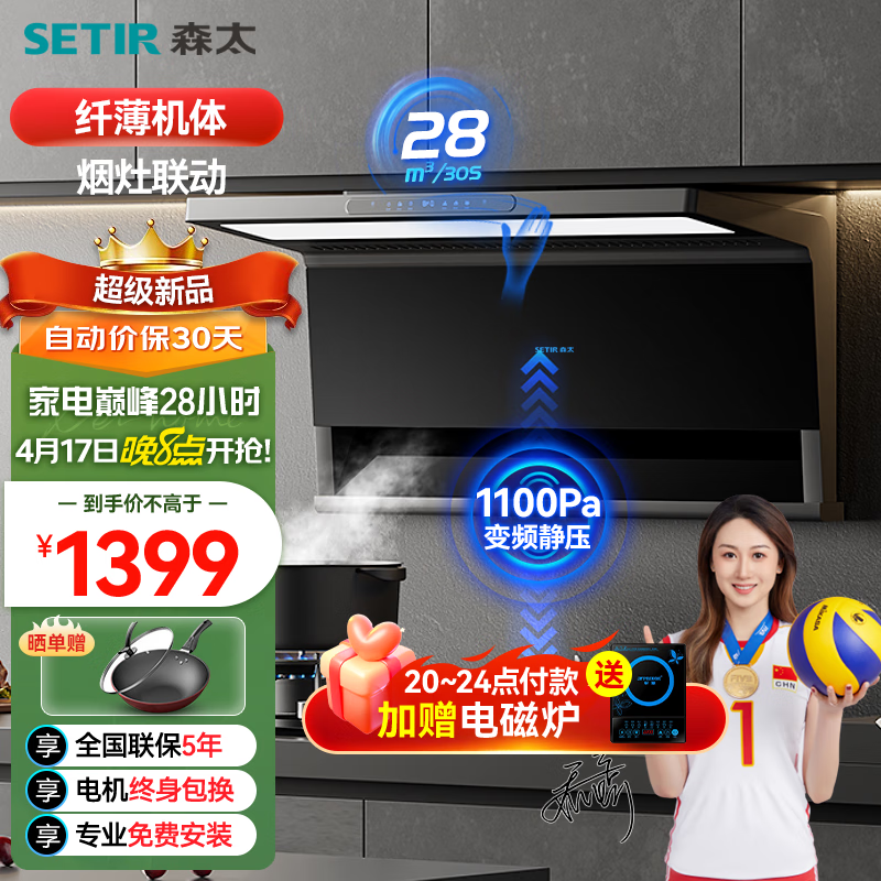 森太(SETIR)顶侧双吸油烟机 1100Pa变频超薄双吸抽油烟机家用烟灶联动红外体感油烟机 CXW-350-BA92BL价格:1599.00元!