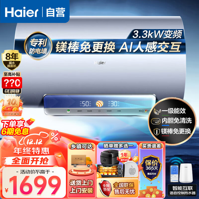海尔(Haier)60升热水器电热水器家用变频速热储水式一级能效内胆免清洗镁棒免更换WiFi智控Fresh7价格:1699.00元!