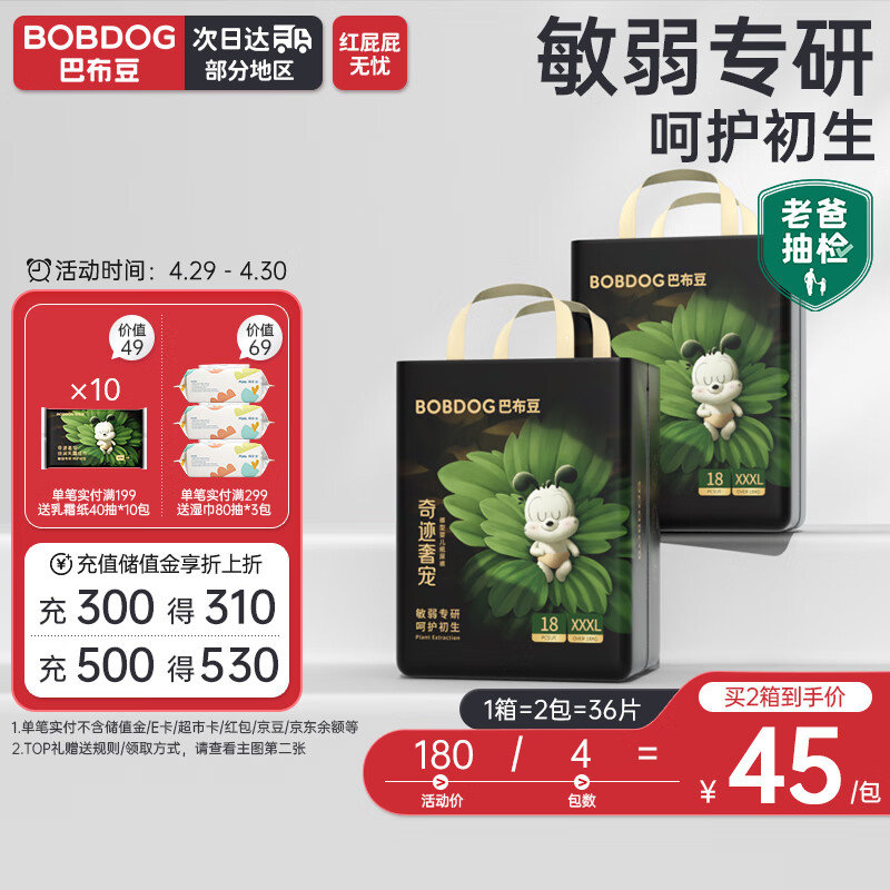 巴布豆(BOBDOG)【老爸】奇迹奢宠裤婴儿拉拉裤XXXL码36片(18-23kg)植萃舒敏价格:158.00元!