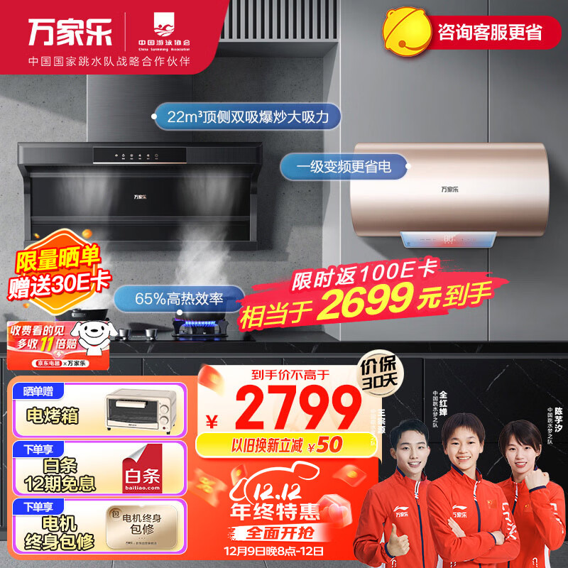 万家乐烟灶热三件套 顶侧双吸油烟机60L出水断电变频节能电热水器套装AK5+KV061B+60FW3天然气价格:2999.00元!