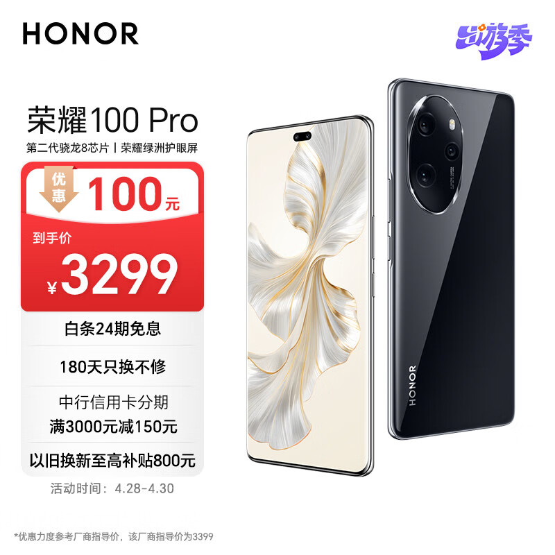 荣耀100 Pro 单反级主摄 荣耀绿洲护眼屏 第二代骁龙8旗舰芯片 AI手机 12+256 亮黑色 5G价格:3289.00元!