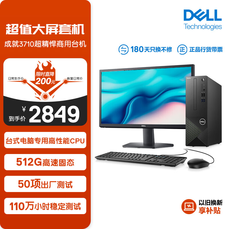 戴尔(Dell)成就3710 台式电脑主机(酷睿12代i3-12100 8G 512GSSD WiFi)21.5英寸显示器 高性能CPU价格:2849.00元!