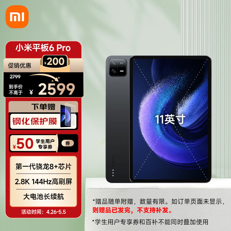 小米平板6Pro xiaomiPad 11英寸 骁龙8+强芯 144Hz高刷 2.8K超清 8+256GB 移动办公娱乐平板电脑黑色价格:2599.00元!