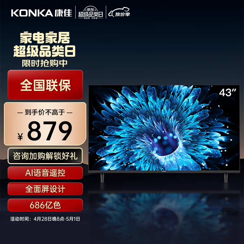 康佳电视 J43 43英寸 1+8GB内存 屏 智能语音 教育资源 网络WIFI 全高清 卧室彩电液晶平板电视机价格:879.00元!