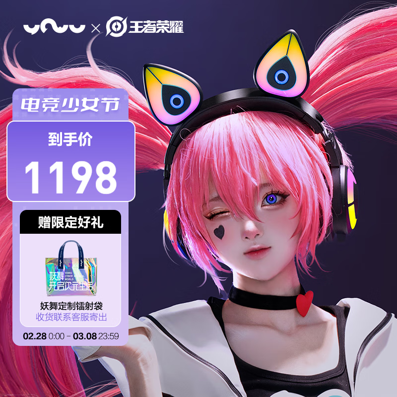 妖舞(YOWU)猫耳耳机 荣耀定制款 头戴式真无线蓝牙RGB游戏电竞电脑耳麦降噪 安琪拉专属造型价格:1398.00元!