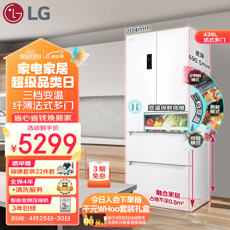 LG 439升 法式多门超薄大容量变温冰箱 纤巧机身 分类存鲜 变温调节 多重冷流 奶油白 M422MHT13B价格:5245.70元!
