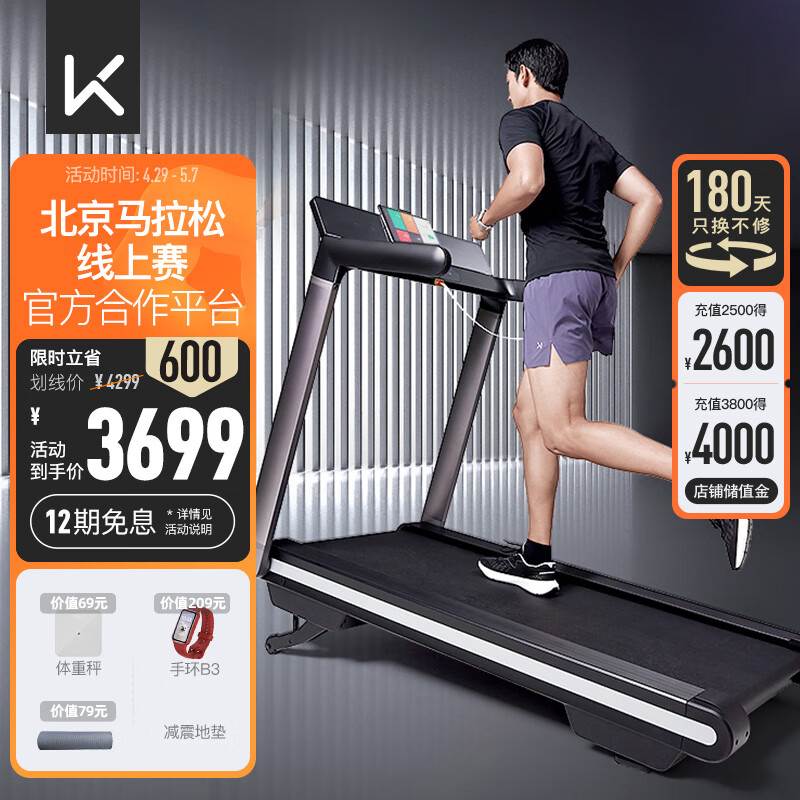 Keep跑步机家用健身器材 智能坡度调节 宽大跑台走步机 家庭锻炼K4黑价格:3699.00元!