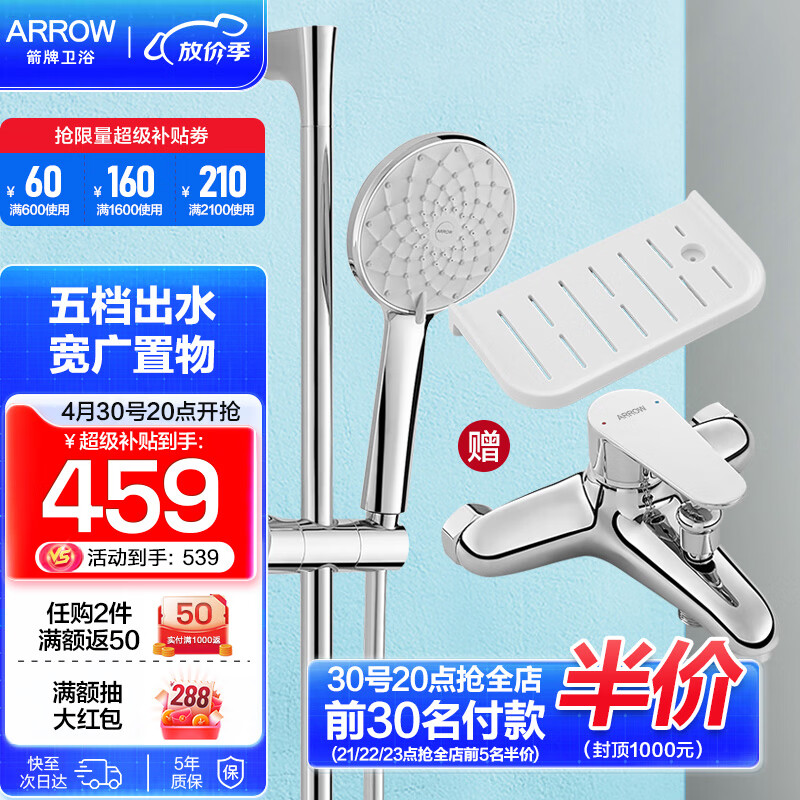 箭牌(ARROW)双功能淋浴花洒套装卫生间精铜淋浴器喷头沐浴莲蓬头冷热花洒软管 圆形双功能置物架花洒3201-P价格:539.00元!