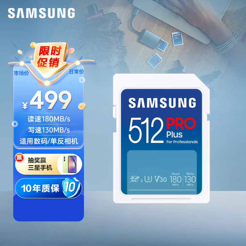 三星(SAMSUNG)512GB SD存储卡ProPlus U3 V30 4K超高清专业数码相机内存卡读速180MB/s写速130MB/s价格:499.00元!
