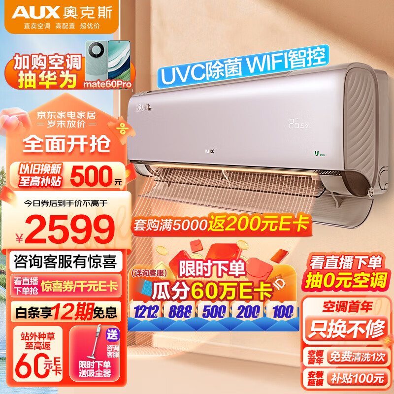 奥克斯(AUX)1.5匹净享风Pro+空调 新一级能效 家用冷暖壁挂式 紫外线除菌KFR-35GW/BpR3DQE1(B1)WiFi智控价格:2699.00元!