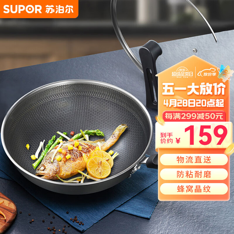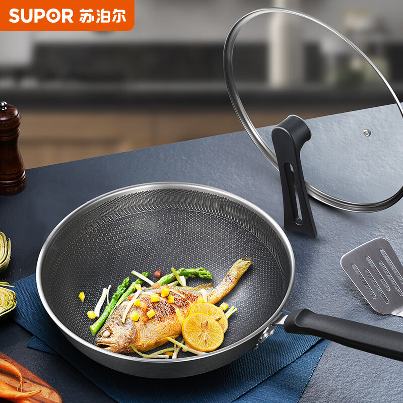 苏泊尔SUPOR 不锈钢蜂窝不易粘炒菜锅30cm煎锅燃气电磁炉通用 EC30JKC01价格:141.00元!