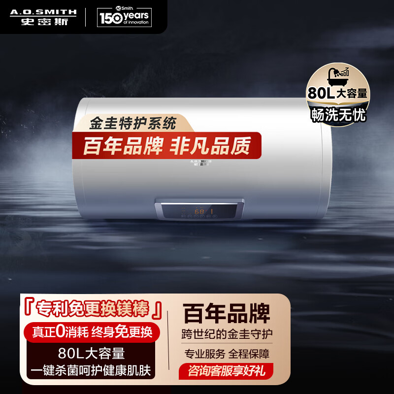 史密斯(A.O.SMITH)80升电热水器 专利免更换镁棒 金圭内胆 速热节能 纤美长款 大屏 E80VC0 一级能效价格:3398.00元!