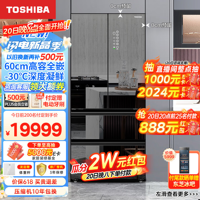 东芝(TOSHIBA)黑钻石家用高容全嵌超薄零嵌法式多门四门镜面电冰箱制冰一级能效变频GR-RF559WI-PG1B1镜夜黑价格:19998.00元!