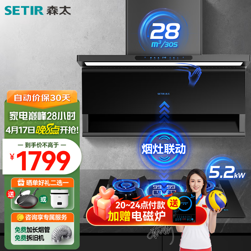 森太(SETIR)油烟机燃气灶套装 1100Pa变频超薄双吸抽油烟机烟灶联动家用定时灶烟灶两件套 BA92BL+T003E天然气价格:2099.00元!