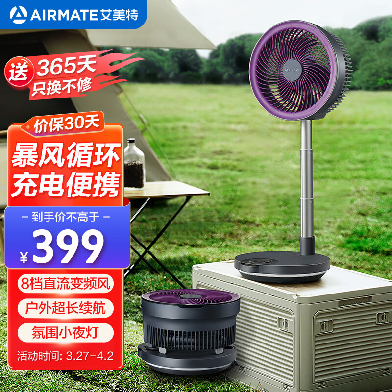 艾美特(AIRMATE)直流变频空气循环扇伸缩折叠易收纳落地扇充电式户外便携小风扇台立式轻音节能柔风风扇 FA20-RD88价格:499.00元!