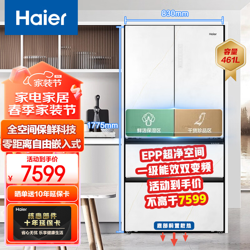 海尔冰箱家用全空间保鲜零嵌入式底部散热超薄一级变频法式四开多门冰箱BCD-461WGHFD14WYU1[家电]价格:7599.00元!