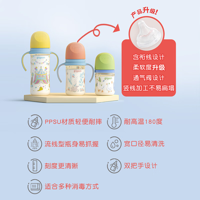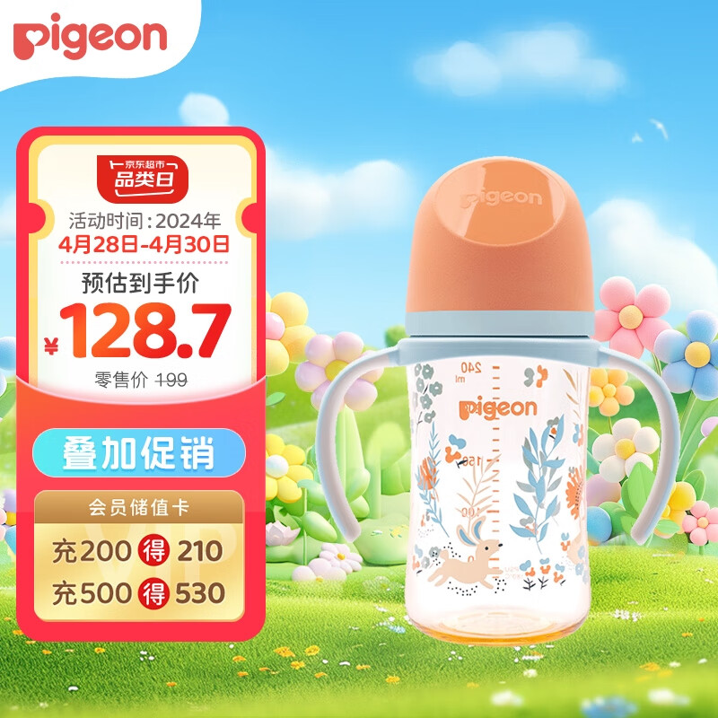 贝亲(Pigeon)自然实感第3代 双把手奶瓶 240ml-丛林小兔 M号 3个月以上 AA218价格:141.30元!