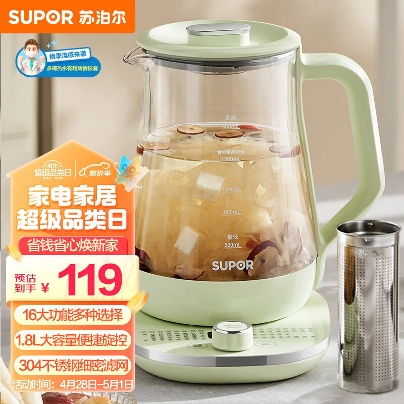 苏泊尔(SUPOR)1.8L大容量养生壶 煮茶器煮茶壶 304不锈钢电水壶 保温恒温花茶壶烧水壶 带滤网 SW-18YJ15B价格:119.00元!
